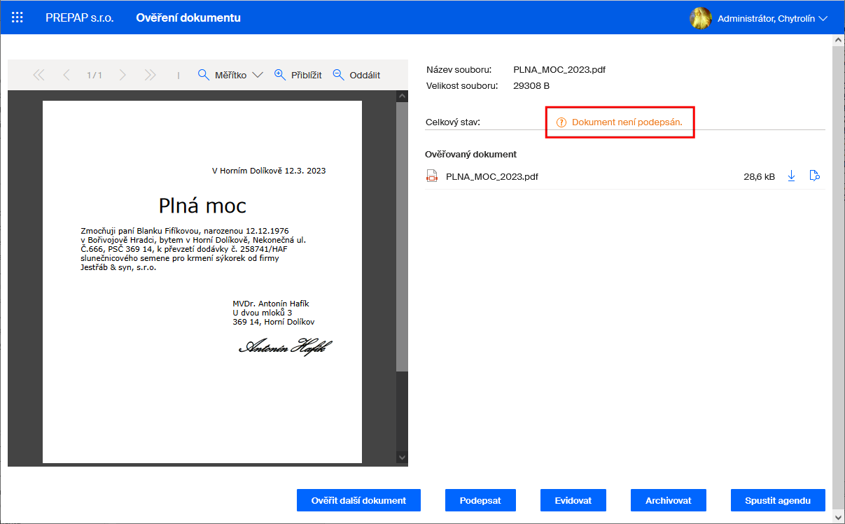 - Během pár chvil před sebou uvidíte informaci o tom, zda je dokument opatřený platným podpisem, certifikátem nebo jinými elektronickými prvky.