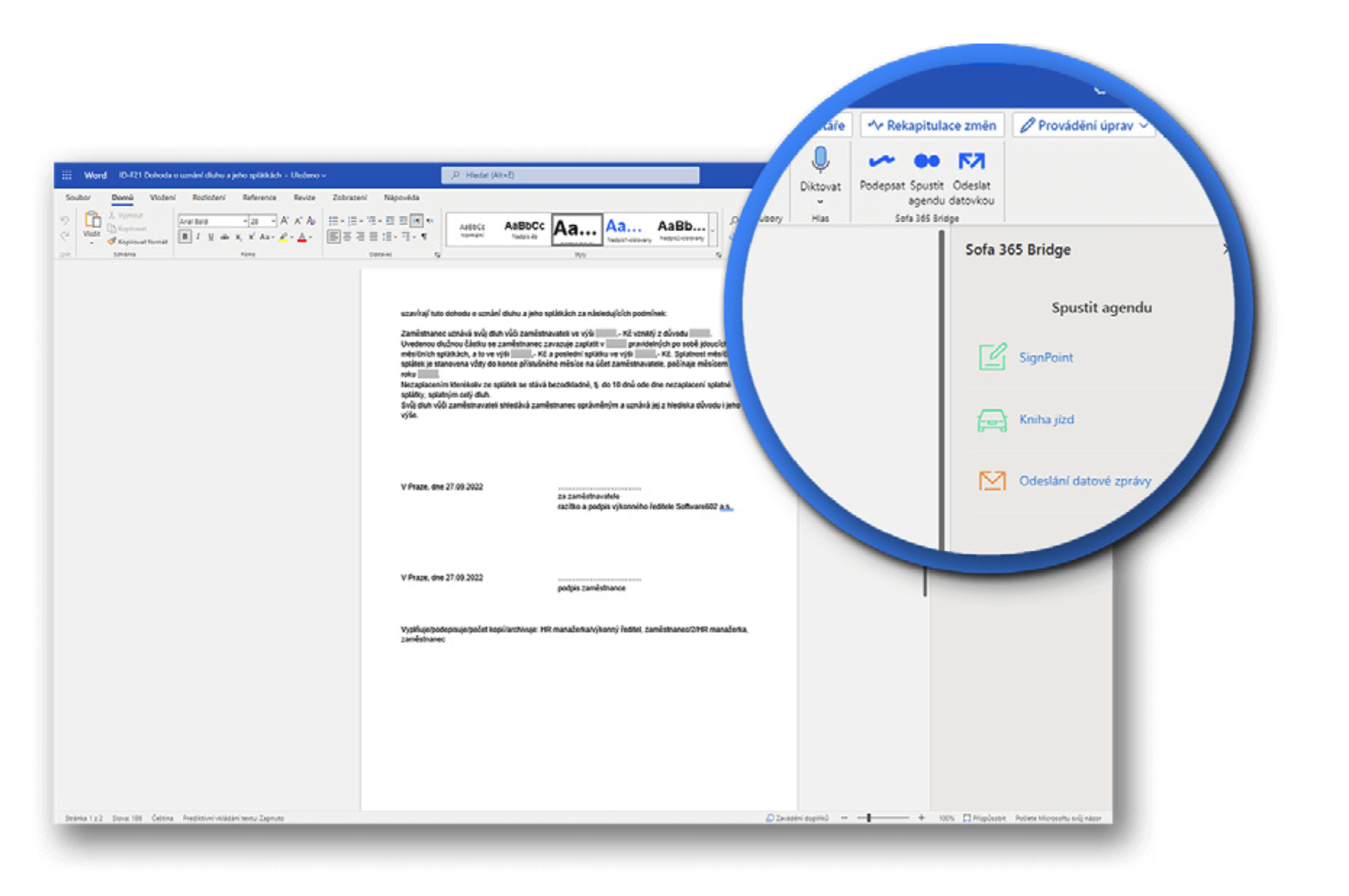 Pokud vaše organizace používá aplikaci Sofa pro bezpapírovou kancelář, můžete přímo napojit Word přes doplněk Sofa Bridge. Poté se vám v pravé části pásu karet Domů zobrazí nová sekce Sofa Bridge s třemi tlačítky: Podepsat, Spustit agendu a Odeslat datovkou. Kliknutím na tlačítko Podepsat se ve Wordu spustí agenda SignPoint, kde můžete aktuálně načtený soubor odeslat do podepisovacího koloběhu v Sofa. V pravé části okna Wordu se otevře panel Sofa 365 Bridge s hlášením o průběhu načítání agendy SignPoint. Otevře se nové okno prohlížeče s načteným formulářem SignPoint, ve kterém je v sekci Soubory k podepsání začleněn soubor s dokumentem, ze kterého jste požadavek na podpis poslali. Ve formuláři vyplňte, kdo všechno má dokument podepsat. Dokument se konvertuje do formátu PDF a teprve poté je odeslán k podpisu. Jakmile všichni dokument podepíší, položku s podepsaným dokumentem naleznete v oknech Dokumenty či SmartSafe – v pohledech Podepsané soubory.