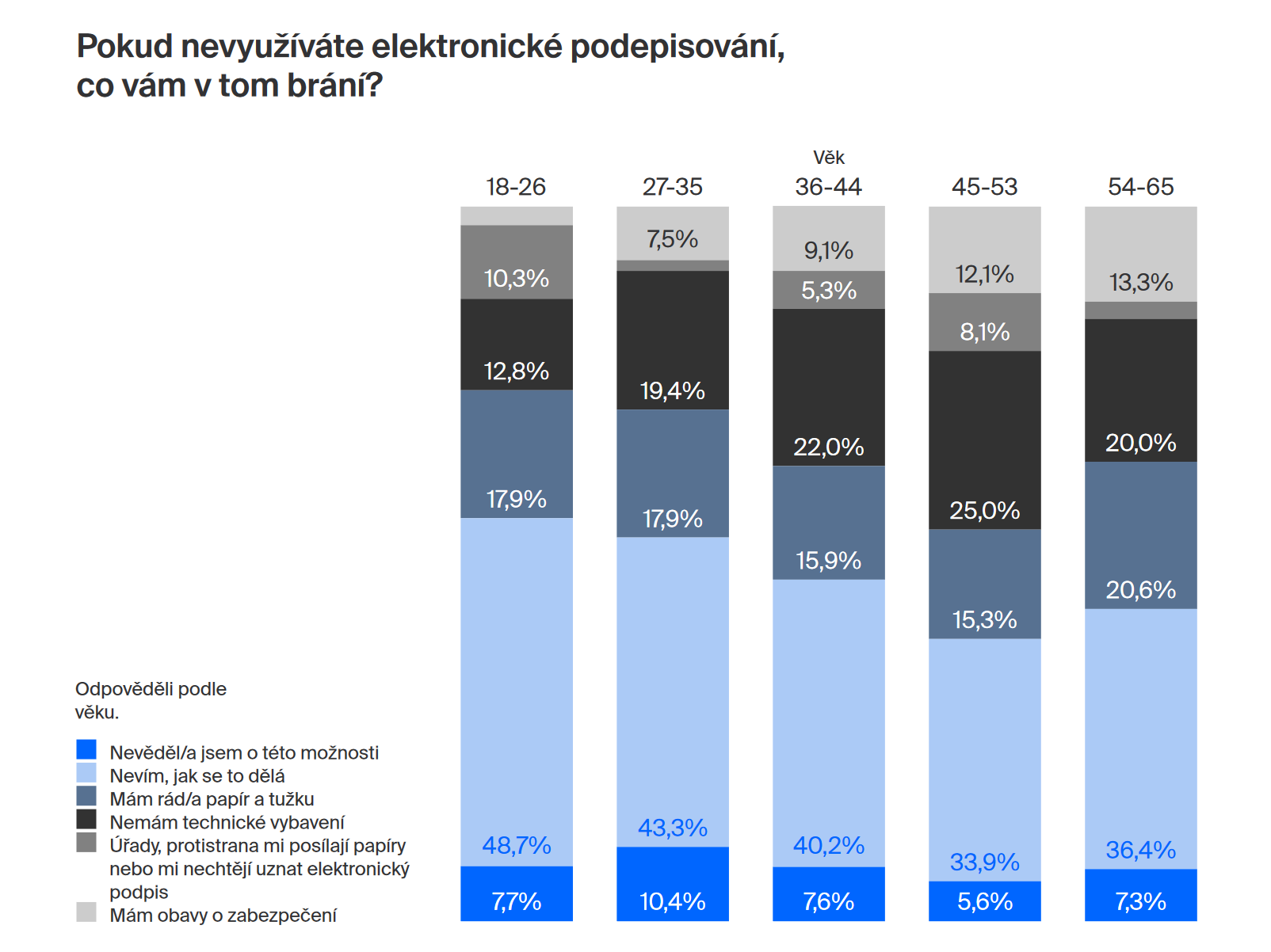 Nevědomost, jak se vlastně elektronicky podepisuje, přiznávali hlavně nejmladší respondenti ve věku 18 až 26 let. Z jejich cílové skupiny to byla téměř polovina z těch, co ještě elektronicky nepodepisují (48,7 %). Odpovídaly tak také více ženy (39,9 %) než muži (37,1 %) a lidé z největších měst nad 100 tisíc obyvatel (42,4 %). Na nedostatečné technické vybavení si stěžovali hlavně starší respondenti z věkové skupiny 45 až 53 let, kde to jako hlavní důvod nepoužívání elektronického podpisu uvedla čtvrtina dotazovaných. Bez ohledu na věk je pak tento důvod nejvíce uváděný dotazovanými ve Zlínském kraji (31 %) a Olomouckém kraji (27,8 %).