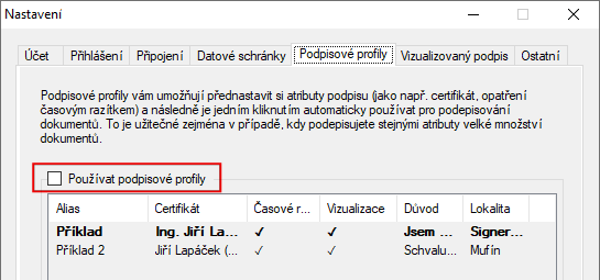| Pokud budete chtít své podpisové profily využívat, musíte mít zaškrtnuté políčko Použít podpisové profily. |