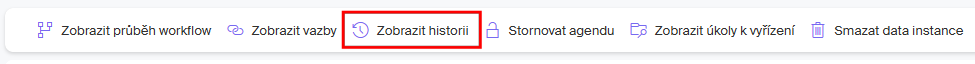 Ke každé agendě lze zobrazit historii jejího průběhu. Příslušné tlačítko najdete na nástrojové liště jedné vybrané agendy nebo v nabídce pod třemi tečkami ve sloupci Agenda.