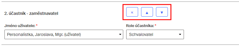Tlačítkem Přidat zaměstnavatele lze vložit další podepisující či schvalující zástupce zaměstnavatele. Jejich pořadí na podepisovací cestě lze nastavit pomocí tlačítek se šipkami.