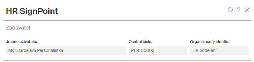 Zadavatelem je účastník, který vyplňuje formulář a sestaví podpisovou cestu. Když jsou dokumenty podepsané (i schválené), agendu uzavírá (archivuje) účastník v roli HR správce.