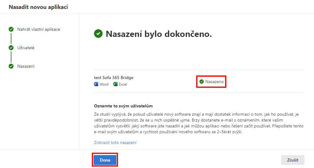 Tím je aplikace nasazena, a ještě je zapotřebí ji začlenit do Wordu a Excelu.