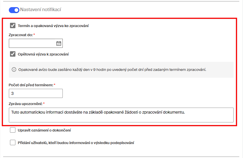 V sekci Nastavení notifikací je mimo jiné i podsekce ovládaná zaškrtávacím políčkem Termín a opakovaná výzva ke zpracování. Volitelná přístupnost této sekce je dána nastavením konfigurační proměnné configShowNotifications (Povolit zobrazení nastavení oznámení).