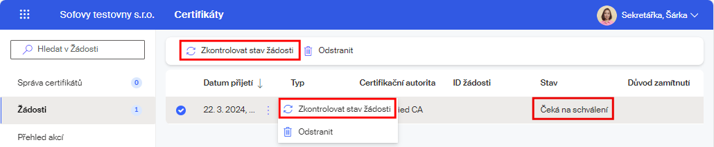 Nyní budete čekat, až žádost zpracuje uživatel obsazený do role Správce certifikátů.